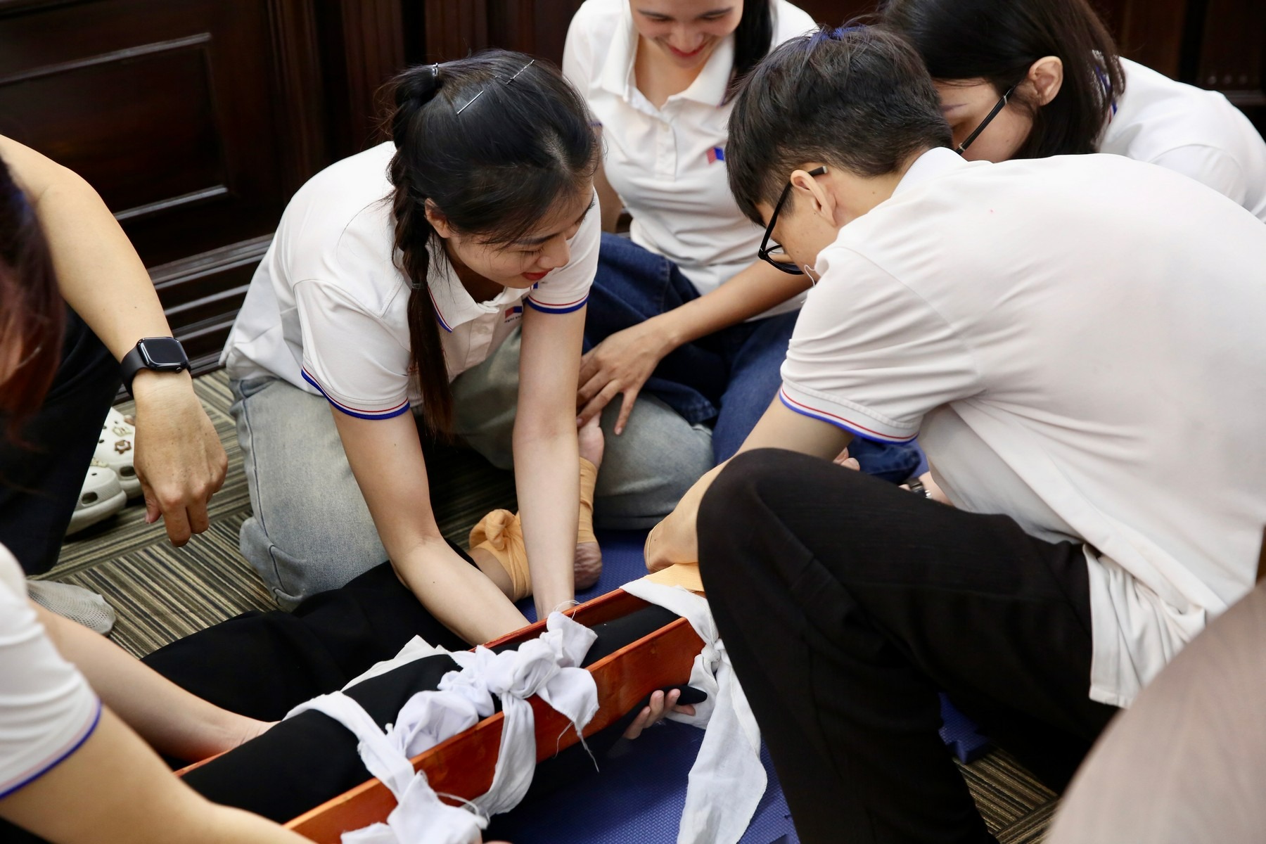 Tại khóa học, học viên được trang bị những kiến thức, kỹ năng cơ bản về sơ cấp cứu, gồm quy trình hồi sức tim phổi (CPR), cách sử dụng máy khử rung tim tự động (AED), cùng các kiến thức nền tảng và quy trình xử lý đối với những tình huống thường gặp như đột quỵ, đau tim, sốc nhiệt, căng cơ, bong gân, gãy xương…