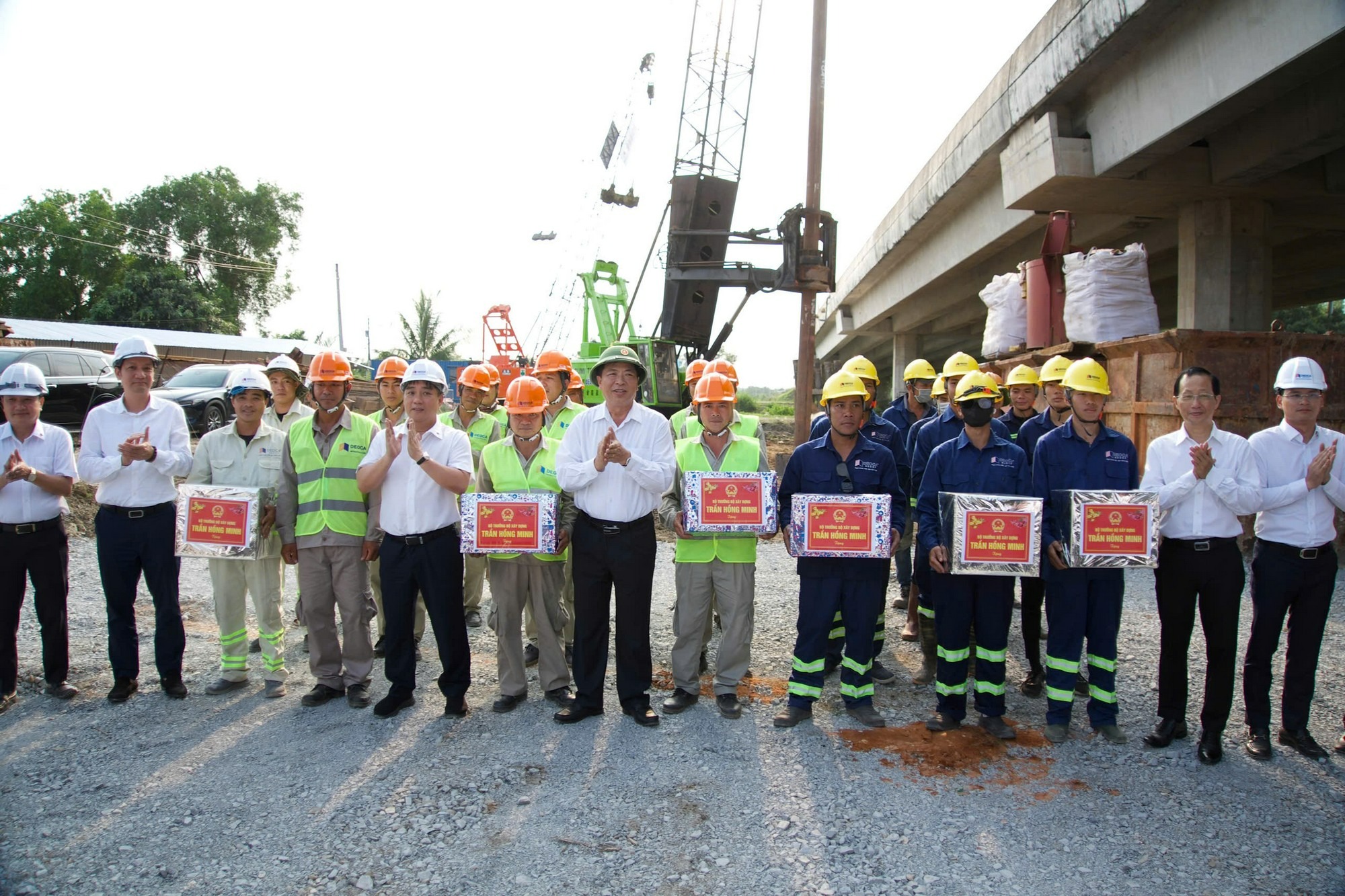 Bộ trưởng Trần Hồng Minh tặng quà động viện người lao động thi công trên công trường cao tốc TP.HCM - Trung Lương - Mỹ Thuận.