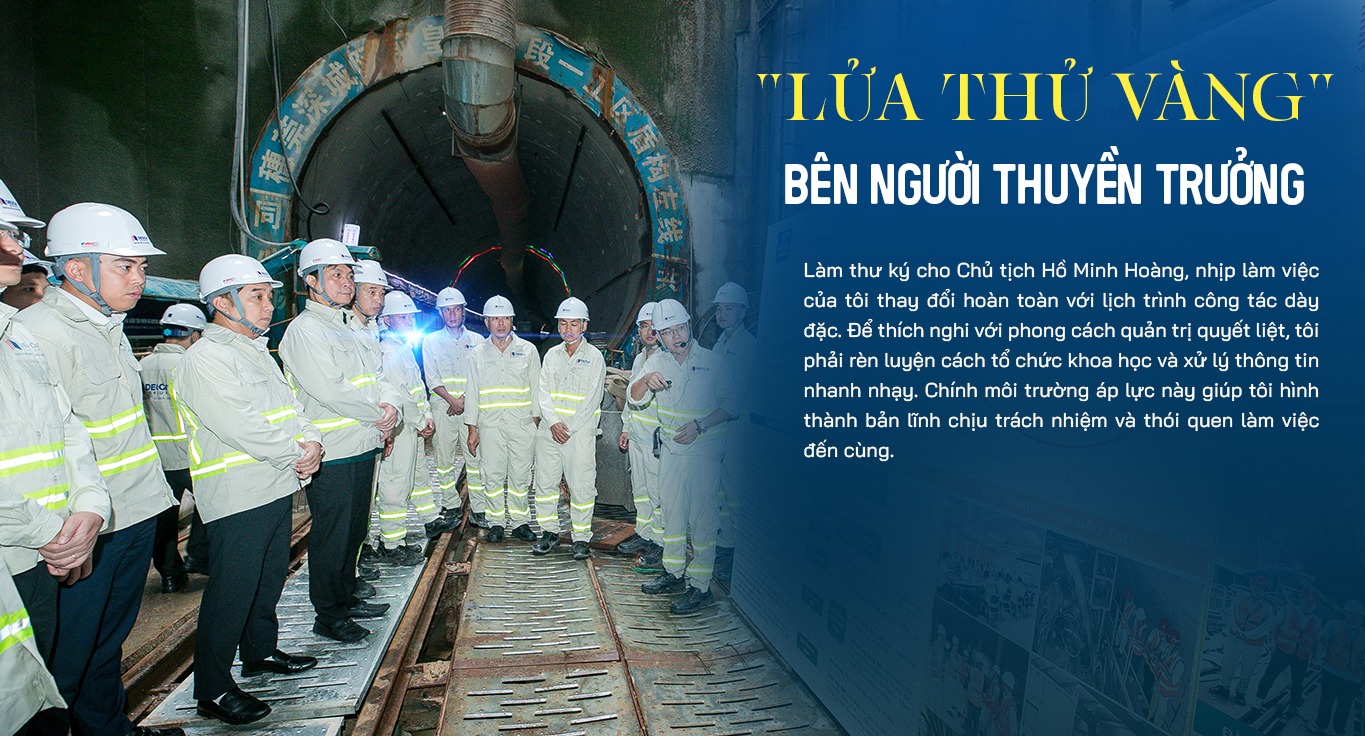 Sau một thời gian làm việc, tôi may mắn được giới thiệu làm thư ký cho Chủ tịch HĐQT Hồ Minh Hoàng. Từ thời điểm đó, nhịp làm việc của tôi thay đổi hoàn toàn. Có những chuyến công tác phải liên tục di chuyển giữa công trường, địa phương và phòng họp. Với cường độ làm việc rất cao của Chủ tịch, tôi phải học cách tổ chức công việc khoa học hơn, xử lý thông tin nhanh và chính xác hơn, đồng thời thích nghi với phong cách quản trị quyết liệt, chủ động và không thỏa hiệp với sự trì trệ. Áp lực lớn, nhưng chính môi trường đó rèn cho tôi thói quen làm việc đến cùng và không né tránh trách nhiệm.