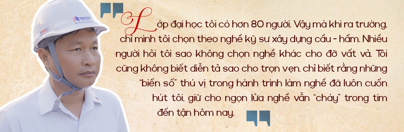 Lớp đại học tôi có hơn 80 người. Vậy mà khi ra trường, chỉ mình tôi chọn theo nghề kỹ sư xây dựng cầu – hầm. Nhiều người hỏi tôi sao không chọn nghề khác cho đỡ vất vả. Tôi cũng không biết diễn tả sao cho trọn vẹn, chỉ biết rằng những “biến số” thú vị trong hành trình làm nghề đã luôn cuốn hút tôi, giữ cho ngọn lửa nghề vẫn “cháy” trong tim đến tận hôm nay.